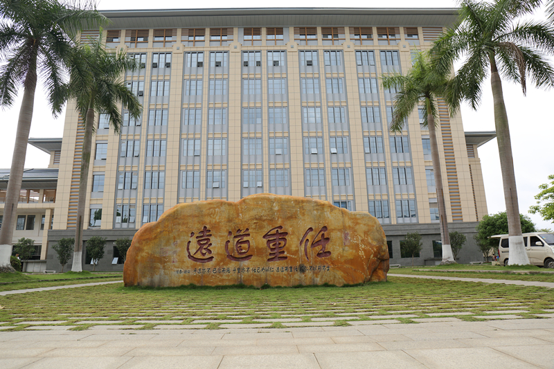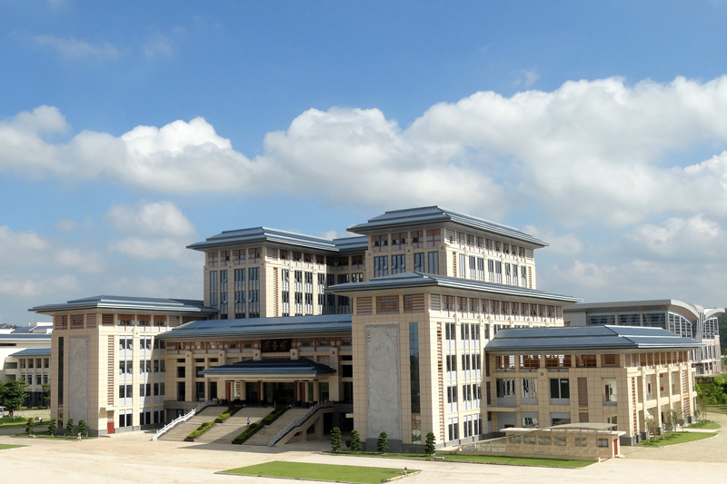 二楼大堂的地面上铺设有太极阴阳鱼图案,墙上是一幅由晨钟暮鼓楼校门及邕江组成的壁画,联曰:“月明风清更有半江渔火引目去,日曦气紫且迎一天云霞扑面来”。道出了位于邕江之畔的仙葫校区,依山傍水,环境优雅,在这里源远流长的华夏文化与博大精深的中医文化融为一体,很好地体现出学校的办学理念和校园文化特色,正是潜心学习和兴办大学的绝佳场所。
