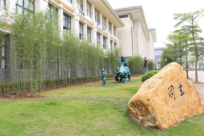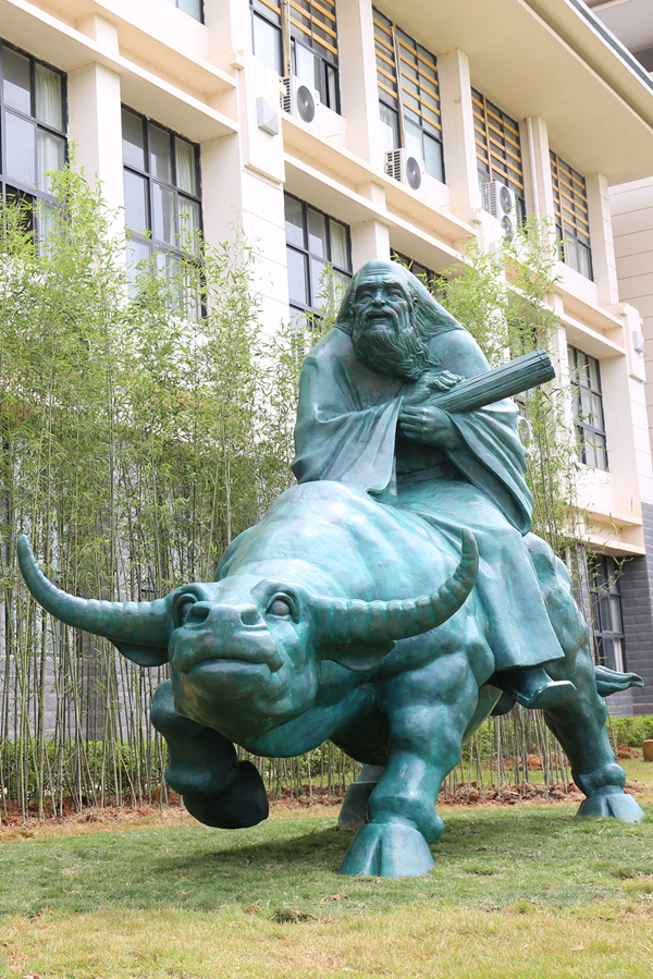 “老子出关”雕塑系我国著名雕塑家、广西美协主席石向东教授作品,坐落在杏林大道与岐伯路交叉路口教学楼旁草坪处。