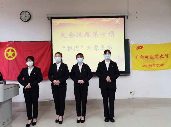 会议伊始,庄元烨为参会人员介绍推优大会流程,全体成员齐唱团歌,党支部代表组织大家一起学习“推优”知识。随后,四位推优对象韦娅、刘梦华、谢华秀、陈金莲依次上台进行自我总结、阐述自己的入党动机,并表现出了坚定的入党决心。本次大会本着公平、公正、公开的三大原则,全体团员无记名投票,4名团员顺利通过班级推优。望其在今后改善自身不足,继续发扬优点,努力成为一名光荣的中国共产党党员。会后,班主任李善良老师对本次大会给予充分肯定,对同学们寄语:希望身处和平年代的我们,珍惜当下努力学习不断提高自身综合能力,积极入党,为国奉献。
