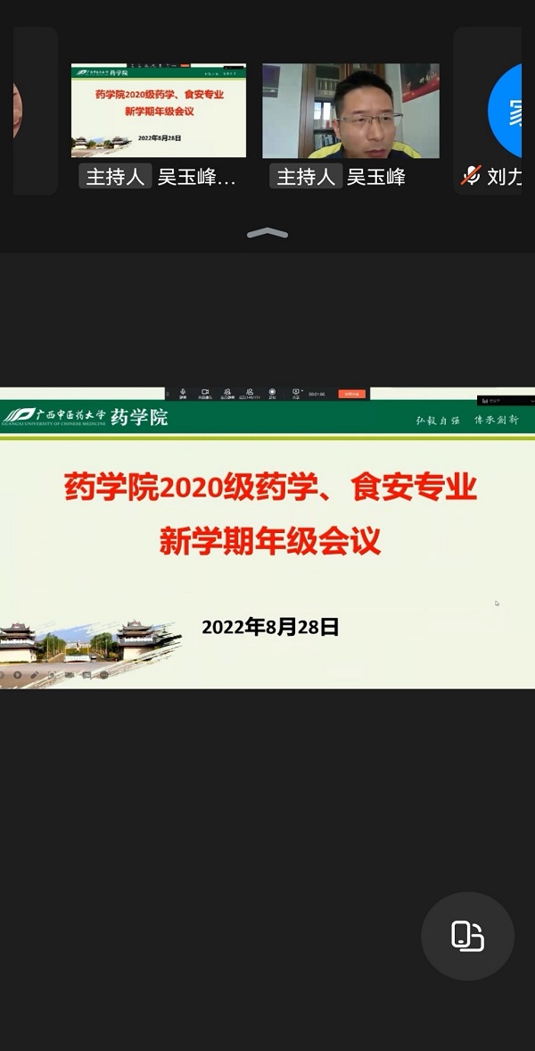 8月28日下午,药学院2020级药学、食品质量与安全专业在钉钉平台举行新学期第一次线上年级会议。本年级全体学生参加此次会议,辅导员吴玉峰老师主持会议并讲话。