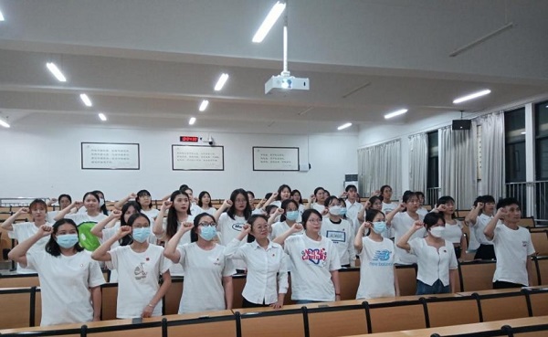 会上,主持人带领各位同学了解我们所处的新时代,经济体量的增长,革命的先进成果和科技上量子通信与登月的进步,让同学们认识到国家正朝着全面建设社会主义现代化国家、全面推进中华民族伟大复兴而团结奋斗。在全体同学坚毅的信心和眼神中,宣誓重温入团誓词和奏唱团歌。同学们意识到正处青春风华,应做一个有理想、有知识、能吃苦、肯奋斗的当代青年大学生,将个人理想融入到党和国家的事业中,不忘初心,牢记使命。