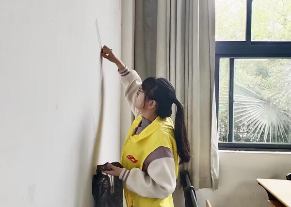 志愿者清理教室墙上胶带