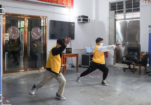 志愿者向老人展示长拳打法