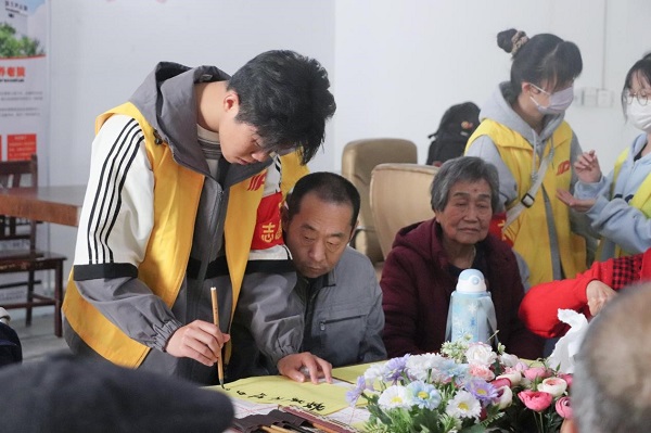 志愿者与老人一同学习书法