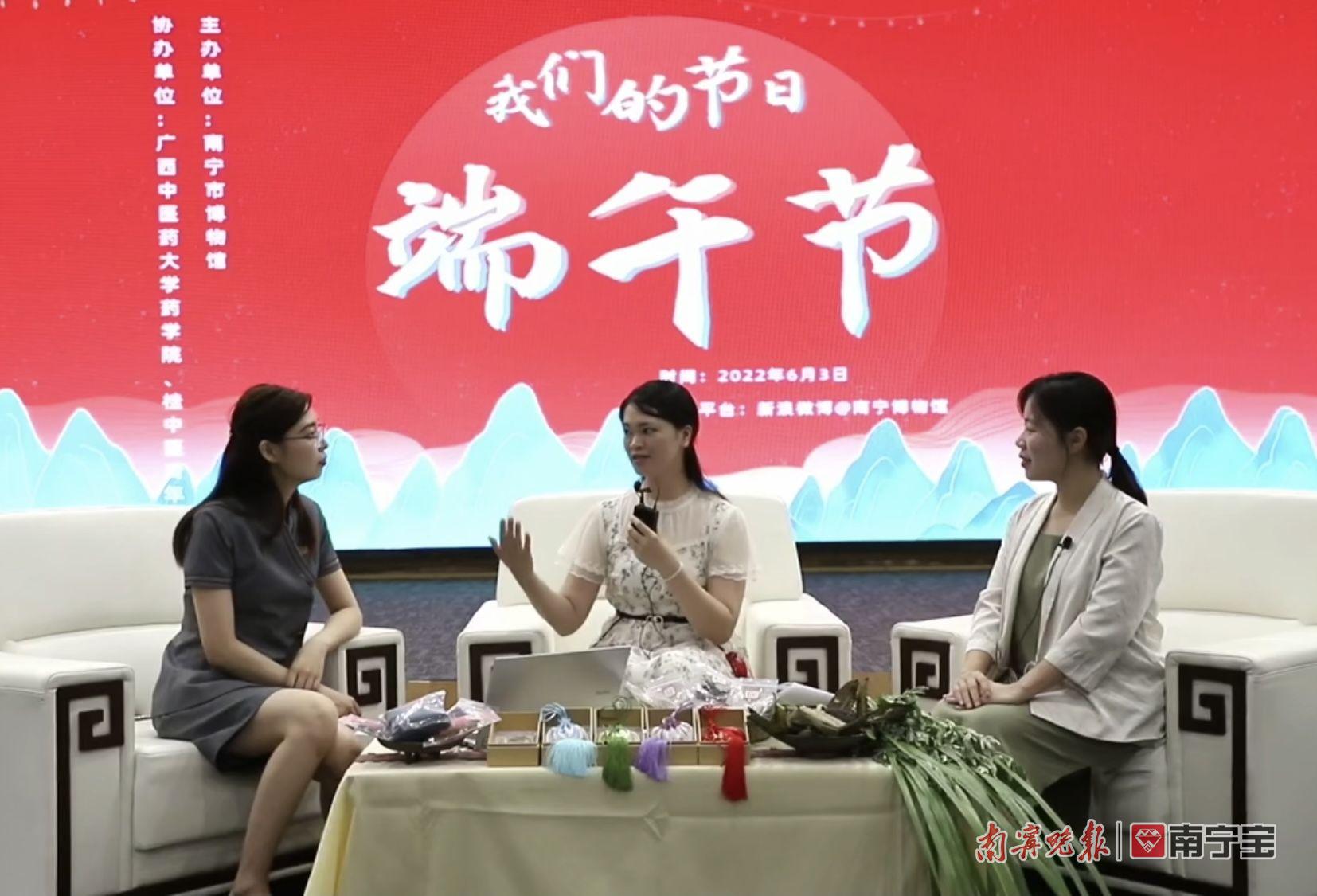 当天上午10点30分,应南宁市博物馆特别邀请,支部组织委员兼纪检委员涂冬萍副教授做客“我们的节日——端午节”云课堂,结合养生药膳及壮医药知识,介绍端午节的由来和习俗,并重点对蓝靛制衣、沐兰汤、挂艾叶菖蒲、缠五色线、佩戴香囊、喝雄黄酒、吃五色粽等古老的端午习俗所蕴含的医药文化进行讲解,分享实用的端午养生妙招,直播观看人数达3700人次,该直播课堂还经南宁晚报、南宁宝APP等媒体报道,获得良好的反响。