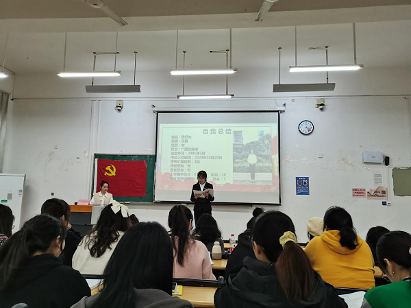 会中,支部书记孙慧玲发言中指出,支部成员应时刻牢记为人民服务宗旨,争取做“功在当代,利在千秋”的党员,并鼓励支部成员树立明确的目标,努力拼搏,丰富大学生活。