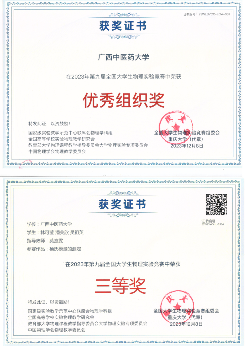 近日,药学院数理教研室指导的五支本科生团队,参加在重庆大学举办的第九届全国大学生物理实验竞赛。本次竞赛有来自全国600余所高校的2251份作品参赛,beat365有5支队伍分别参加了命题类创新作品、自选课题类创新作品、物理实验讲课等三个类别的比赛,获得了全国三等奖1项,优秀奖4项及“优秀组织奖”的良好成绩。
