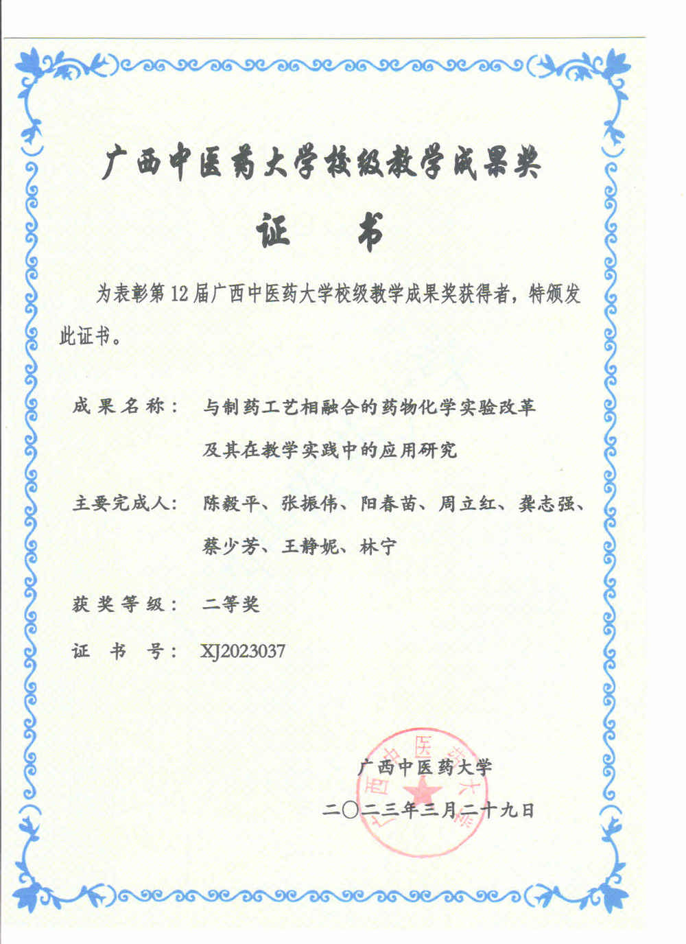 据beat365官方网站《beat365官方网站关于公布第十二届校级教学成果奖名单的通知》(桂中医大教评[2023]9号)文件精神,药学院药物化学教研室肖泽恩副教授主持的《基于“德智能”三位一体的药物化学课程教学模式的改革与实践》研究成果荣获一等奖,陈毅平教授主持的《与制药工艺相融合的药物化学实验改革及其在教学实践中的应用研究》研究成果荣获二等奖。此次获奖是本教研室近年来不断进行理论与实践探索的结果,将为本教研室不断提高药学应用型人才培养质量提供更加行之有效的教学经验和方法。