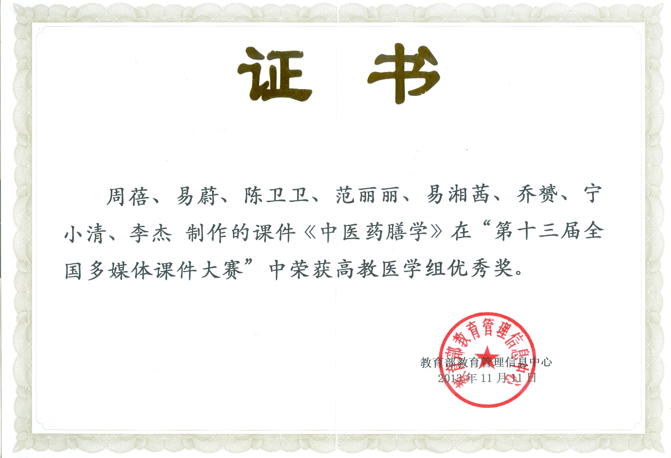 《中医药膳学》在“第十三届全国多媒体课件大赛”中获高教医学组优秀奖