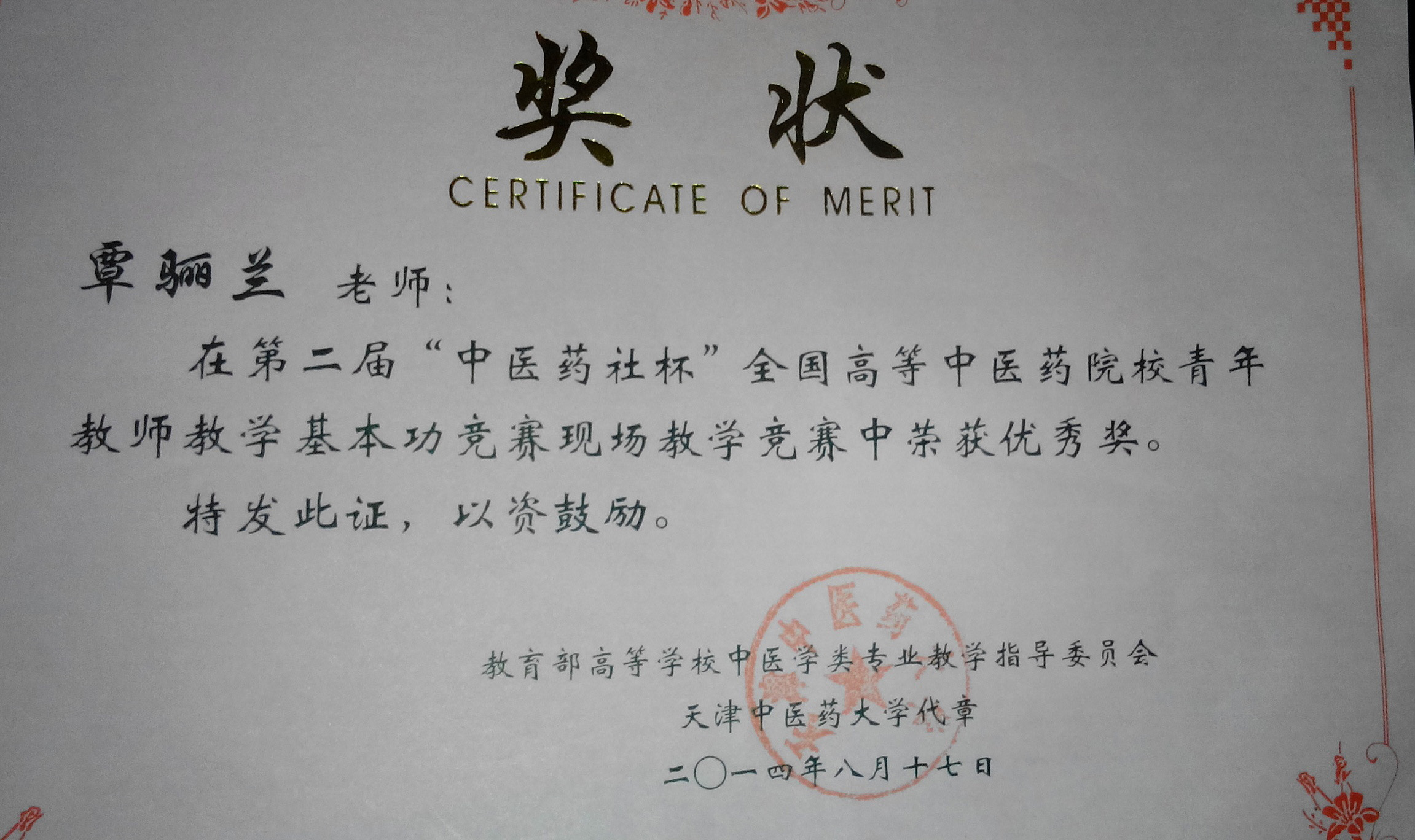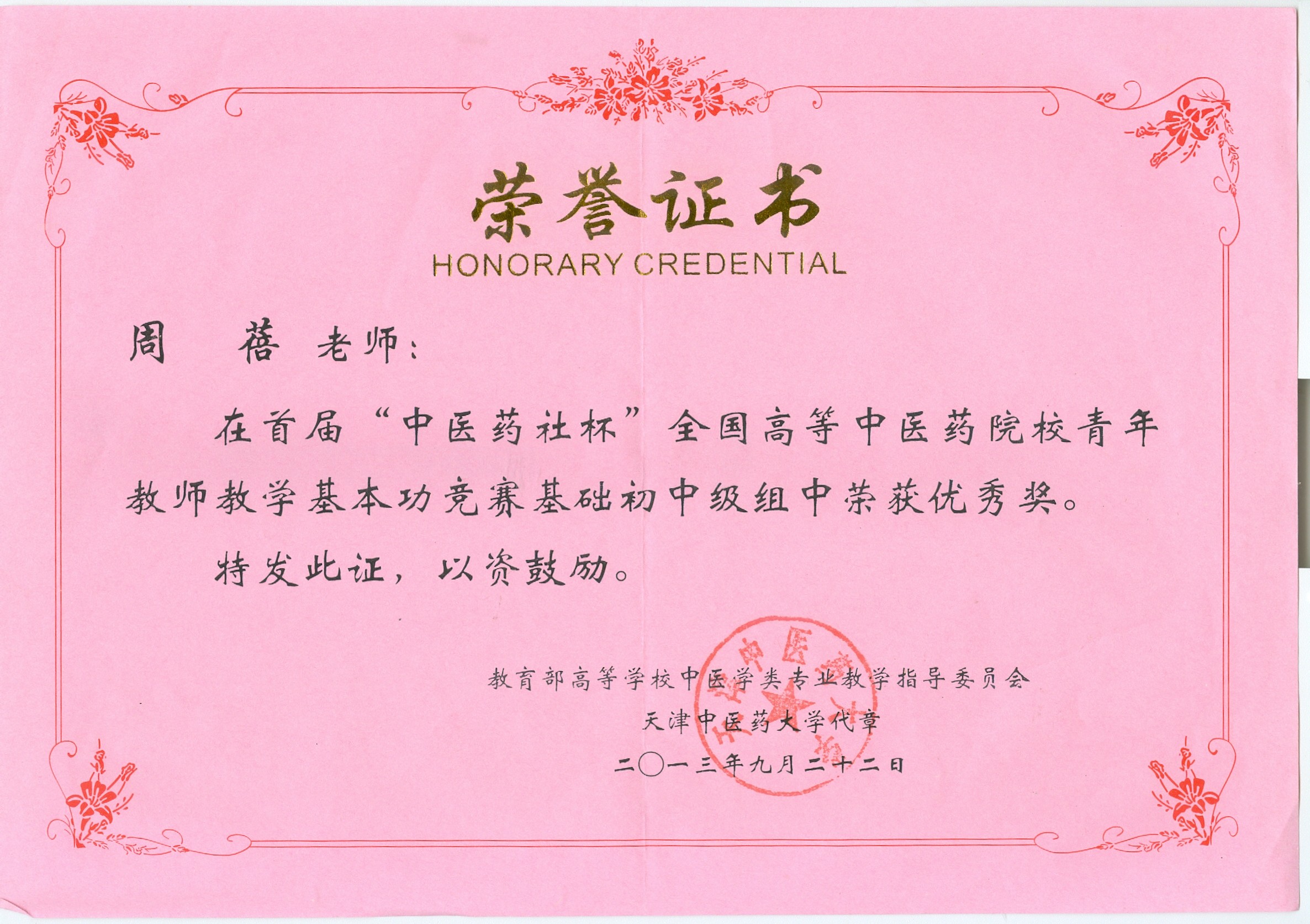 周蓓老师获“中医药社杯”基础初中级组优秀奖