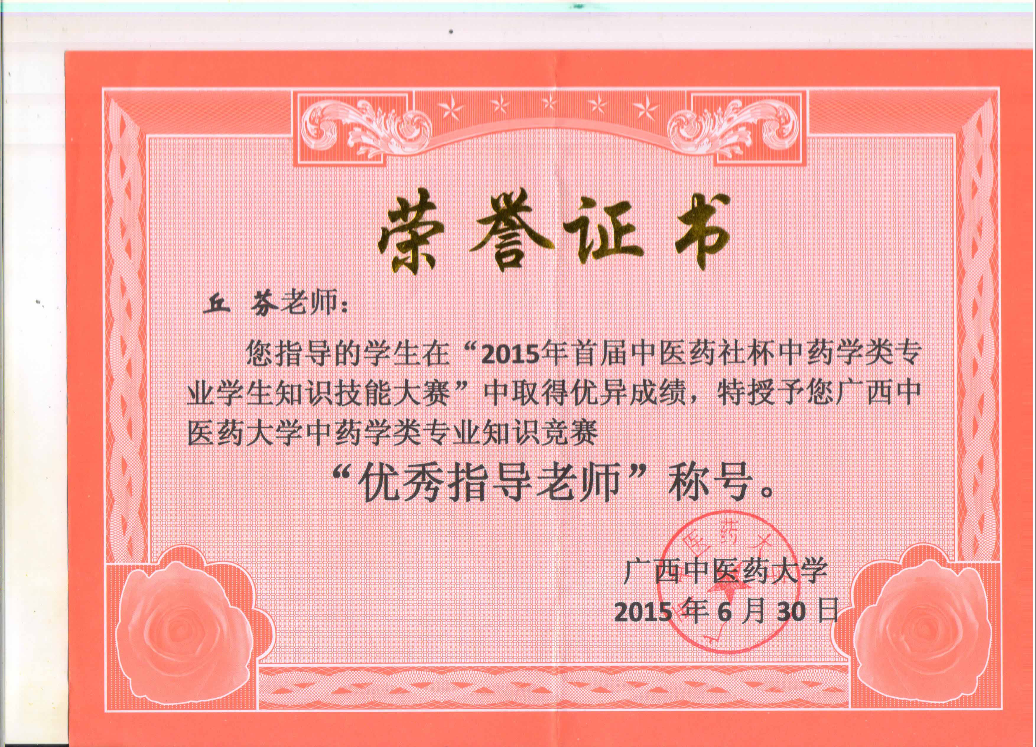 覃骊兰老师荣获“优秀指导老师”称号