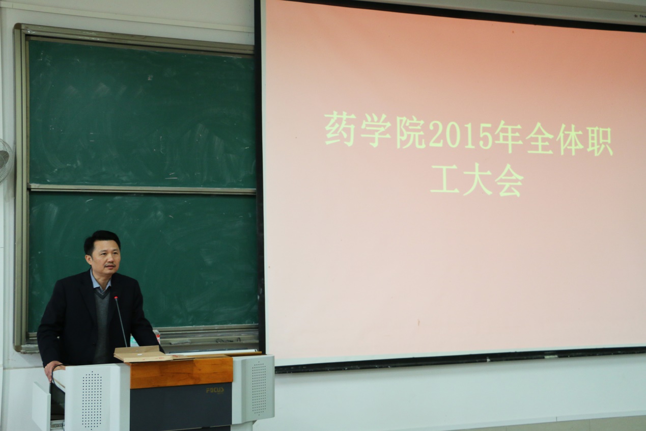 2016年1月13日下午,药学院在仙葫校区教学楼1-303教室召开药学院2015年年度工作总结暨表彰先进会,药学院全体教职工参会,庞宇舟副校长出席大会并发言。会议由药学院党委王勤书记主持。