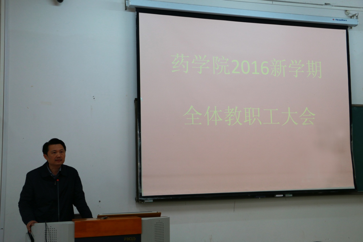 2016年3月4日上午,药学院在仙葫校区教学楼2-102教室召开了药学院2016年新学期全体教职工大会。会议由党委书记王勤主持,学校庞宇舟副校长出席会议并讲话。