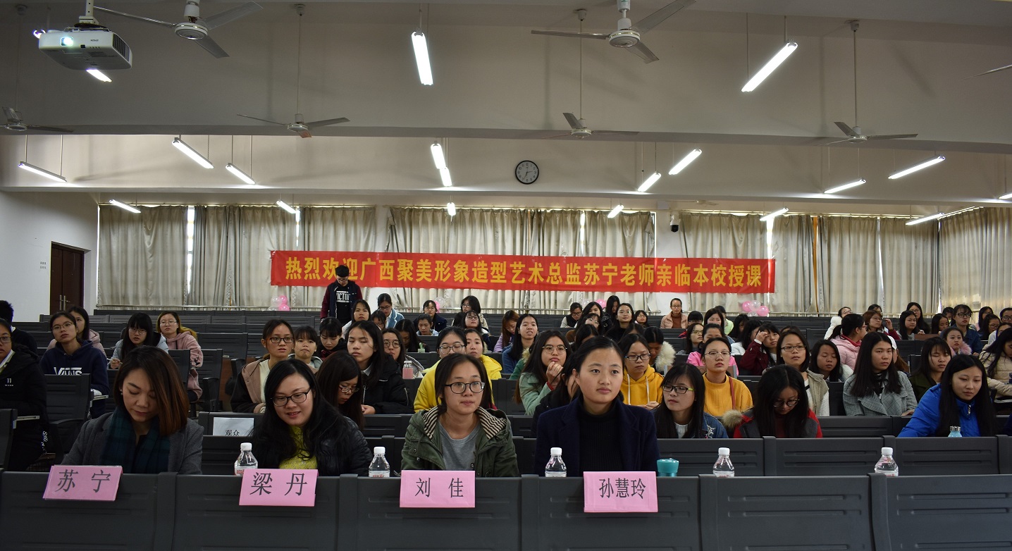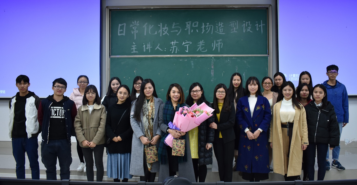 为了进一步做好毕业生的就业工作,提高毕业生的求职技能与竞争力。药学院邀请了广西聚美形象设计有限公司创始人,广西电视台主持人化妆造型师苏宁老师,近期在仙葫校区1—301教室举行“职场化妆与造型设计专题”讲座。药学院辅导员孙慧玲、刘佳及勤工俭学协会指导老师梁丹参加了讲座。