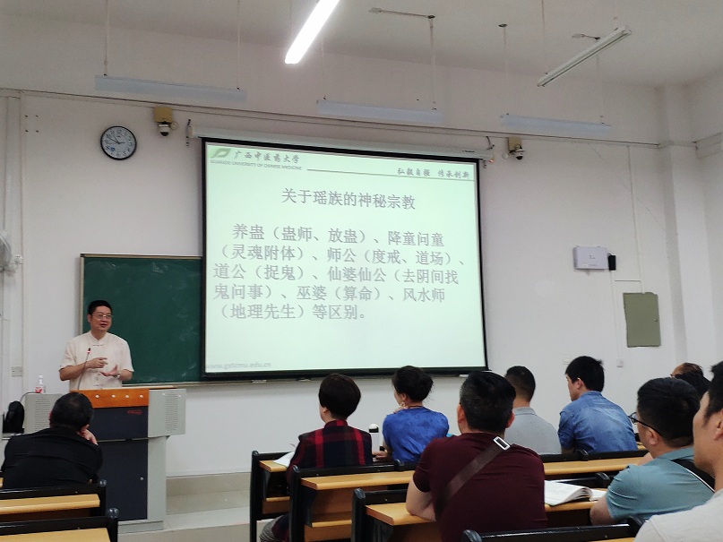2019 年5月21日,beat365官方网站瑶医药学院李彤教授分别在本校仙葫校区教学楼1-410室和明秀校区新东二教室及明秀校区实训中心6楼,作关于广西壮族自治区非物质文化遗产“瑶医观目诊病”的专题讲座。讲座受到学生的欢迎,现场气氛热烈。