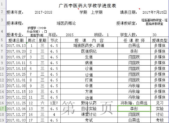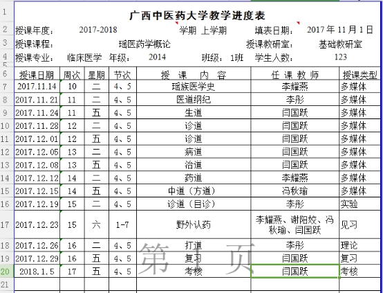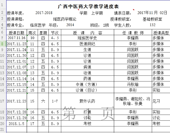 2017-2018年上学期瑶医药概论教学进度表 发布时间:2017-11-17 15:48:38 浏览次数: 次 【字体:小 大】 2017-2018年上学期瑶医药概论教学进度表 分享到: 【打印正文】