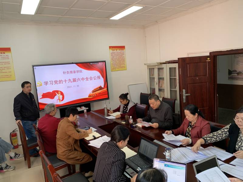 11 月 30 日下午,针灸推拿学院举行 11 月份教职工政治理论学习会,主要学习了党的十九届六中全会公报内容和自治区第十二次党代会精神。本次学习由学院党总支蒋闽义书记进行领学,院长范郁山、 副院长陈靖红、 副院长赵彩娇及全体教职工参加了学习。