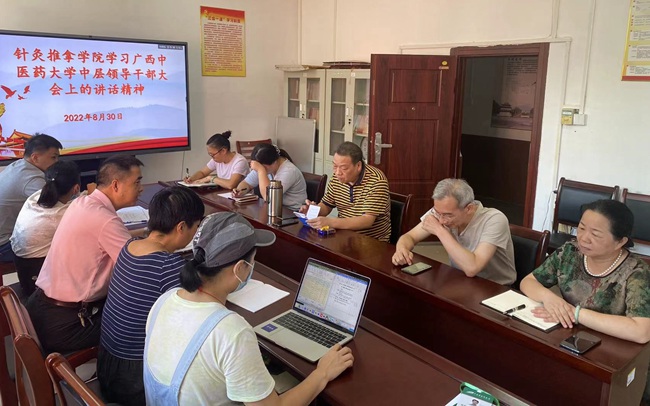 2022年8月30日下午,针灸推拿学院党政领导班子及学院中层以上干部教师在学院416办公室学习了学校党委书记莫锦荣、校长姚春在开学大会上的讲话精神,学院党政领导结合学院的情况做了本学期工作部署。
