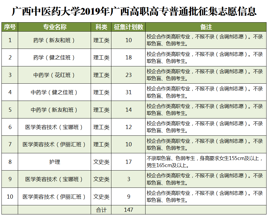 2019年征集志愿-广西高职高专普通批 发布时间:2019-08-10 11:07:27 浏览次数: 次 【字体:小 大】 beat365本次将征集药学(新友和班)等10个专业计划共147名,详情如下: 注:校企合作类高职专业采取“不报不录”原则,只录取有专业志愿(含调剂志愿)的考生。 征集志愿填报时间:8月11日下午18:30至12日上午9:00,请考生在规定时间内到广西招生考试院官网(http://www.gxeea.cn)进入“2019年普通高等学校招生志愿填报”填报征集志愿,并在录取期间保持报名时所留联系电话畅通。 详情请点击“征集志愿”。 分享到: 【打印正文】