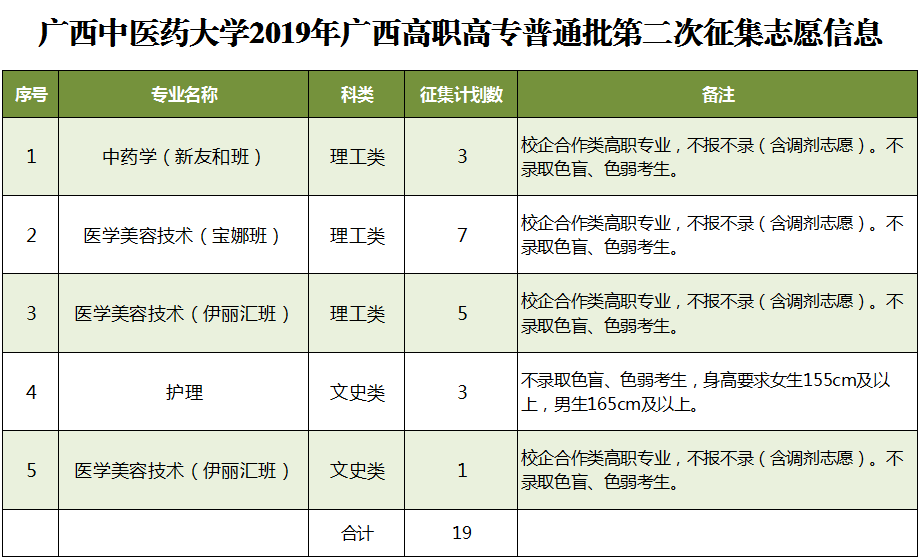 2019年征集志愿-广西高职高专普通批第二次 发布时间:2019-08-13 11:23:49 浏览次数: 次 【字体:小 大】 beat365本次将征集中药学(新友和班)等专业计划共19名,详情如下: 征集志愿填报时间:8月13日下午18:30至14日上午9:00,请考生在规定时间内到广西招生考试院官网(http://www.gxeea.cn)进入“2019年普通高等学校招生志愿填报”填报征集志愿,并在录取期间保持报名时所留联系电话畅通。 详情请点击“征集志愿”。 分享到: 【打印正文】