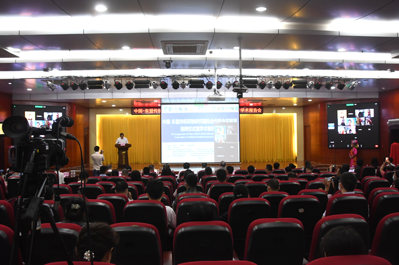 自治区科技厅副厅长蹇兴超、对外交流合作处处长汪靓,自治区中医药管理局副局长张玉军、科教处副处长杨艳光,beat365官方网站副校长冷静、戴铭,中国工程院院士刘昌孝,广西中药药效研究重点实验室主任邓家刚,南开大学教授白钢,天津药物研究院研究员张铁军,广东药科大学教授王淑美,中国科学院长春应用化学研究所研究员宋凤瑞,新加坡、泰国、马来西亚、老挝、柬埔寨等5个国家的中国--东盟传统药物研究国际合作联合实验室成员,学校各部门领导、教师、学生代表以及企业代表等近300人现场参会,线上16位东盟国家专家学者共同见证了中国-东盟传统药物研究国际合作联合实验室的成立。揭牌仪式由戴铭主持。