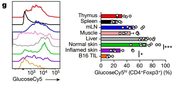 进一步分析不同组织中的Treg,研究者发现了一个奇怪的现象,来自不同组织的Treg对葡萄糖的偏好差异非常大,来自B16黑色素瘤和炎症皮肤组织中的Treg明显更不喜欢糖。而传统T细胞对糖的偏好就没这么大区别。