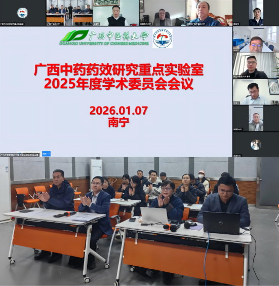 2026年1月7日下午,广西中药药效研究重点实验室召开2025年度学术委员会会议。会议采用“线上+线下”方式进行,学术委员会主任、黑龙江中医药大学王喜军教授,实验室名誉主任、专家顾问邓家刚教授,学术委员会委员南开大学白钢教授,天津药物研究院张铁军研究员,辽宁中医药大学许海玉研究员,海军军医大学张磊教授,首都医科大学王伽伯教授,浙江中医药大学曹岗教授,广西医科大学郭宏伟教授等线上出席,实验室主任郝二伟教授及团队骨干成员现场参会。