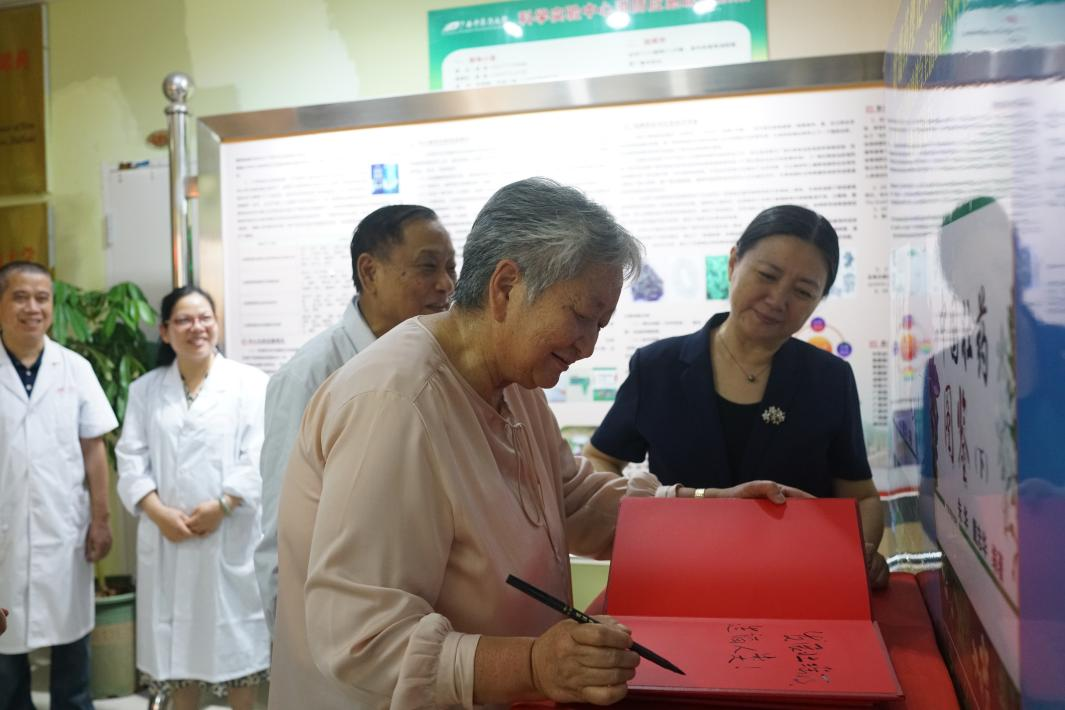 朱华教授向朱兆云院士简要介绍了壮瑶药重点实验室的基本情况,展示了壮瑶药理论和实践研究成果、平台获得的科技奖项、中药壮瑶药资源普查标本库、实验室产品兰香草精油等,并邀请朱兆云院士一行品鉴平台产品葛花露。朱兆云院士对平台成果给予高度评价,在展厅嘉宾名录题词“发展壮瑶药、造福人类”,并留下珍贵合影。