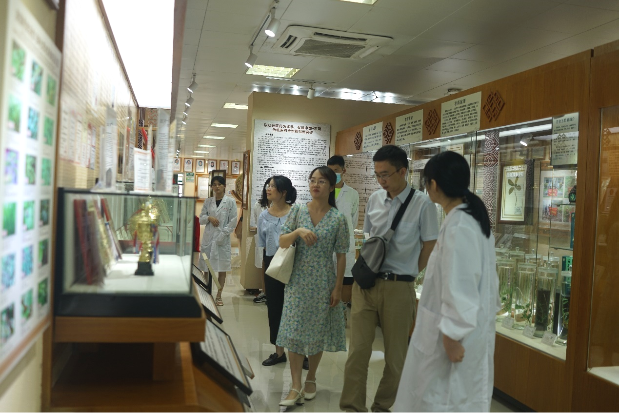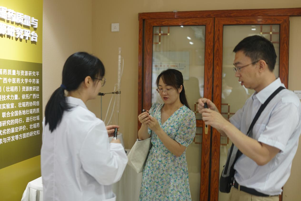 7月6日上午,国家药监局中药材质量监测与评价重点实验室、广西食品药品检验所专家施晓光主任、李丽莉科长等一行莅临本平台考察交流,实验室张淼老师和谢凤凤老师陪同考察。张淼老师简要介绍了壮瑶药重点实验室的基本情况,并展示了壮瑶药理论和实践研究成果。谢凤凤老师向专家介绍了平台获得的科技奖项、中药资源普查标本库等。专家还试用了实验室产品兰香草精油,获得了不错的体验。食品药品检验所一行对平台成果给予高度评价,同时对民族药的研究以及学科建设提出了宝贵意见,并期待日后进一步的交流与合作。