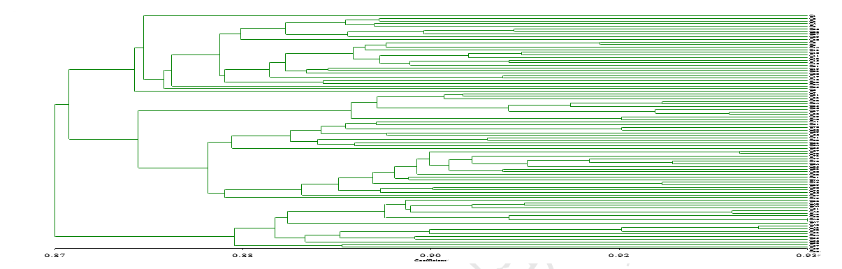 不同产地锡叶藤的主坐标分析:主坐标分析(PCoA)能更直观反应居群的空间距离关系。基于遗传距离及遗传相似度[6],运用 NTSYS-pc 2.1 软件对各居群锡叶藤进行 PCoA 分析,结果见图 7 及图 8 所示。