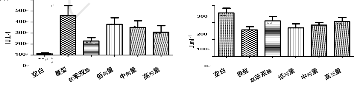 保肝作用机制:锡叶藤醇提物能显著降低 CC14 和酒精所致急性肝损伤小 鼠肝血清中ALT、AST 的含量,综合数据比较,锡叶藤提取物对酒精所致小鼠急性肝损伤优于 CC14 所致急性肝损伤,在检测的十个指标中,对 ALT、ALB、MDA、NO、 CAT、IL-6 这 6 个指标的效果都优于了阳性药联苯双酯。