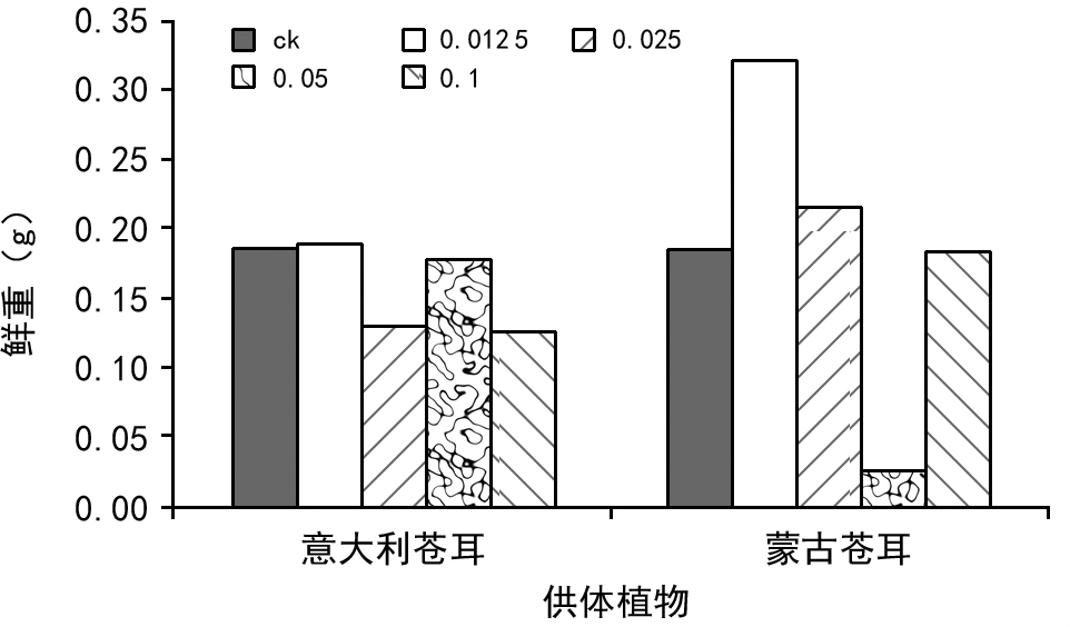 图11 2种外来入侵苍耳子浸提液、不同浓度处理对本土苍耳幼苗鲜重的比较