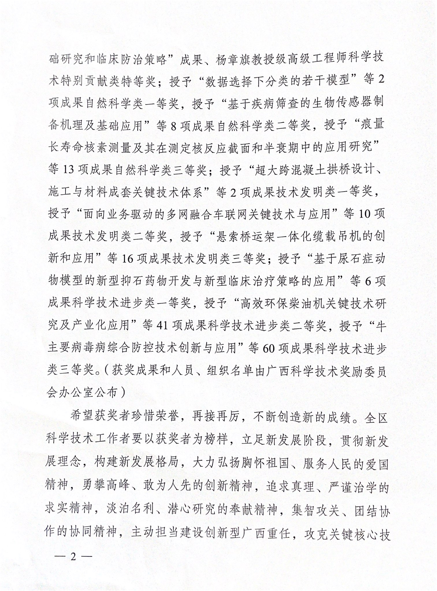 为深入贯彻落实习近平新时代中国特色社会主义思想,全面贯彻党的十九大和十九届二中、三中、四中、五中全会精神,推动振兴,深入实施科教兴桂战略、人才强桂战略和创新驱动发展战略,自治区人民政府对全区科学技术进步、经济发展做出突出贡献的科学技术人员和组织予以奖励。《广西壮族自治区人民政府关于2020年度广西科学技术奖励的决定》(桂政发〔2021〕9号)显示,共有160项科技成果获得2020年度广西科学技术奖。beat365作为第一完成单位有4项科技成果喜获“2020年度广西科学技术奖”,其中我平台朱华教授等主持科技成果喜获“2020年度广西科学技术奖”自然科学奖二等奖(本年度广西中医药民族医药获政府奖自然科学类最高奖项之一)。