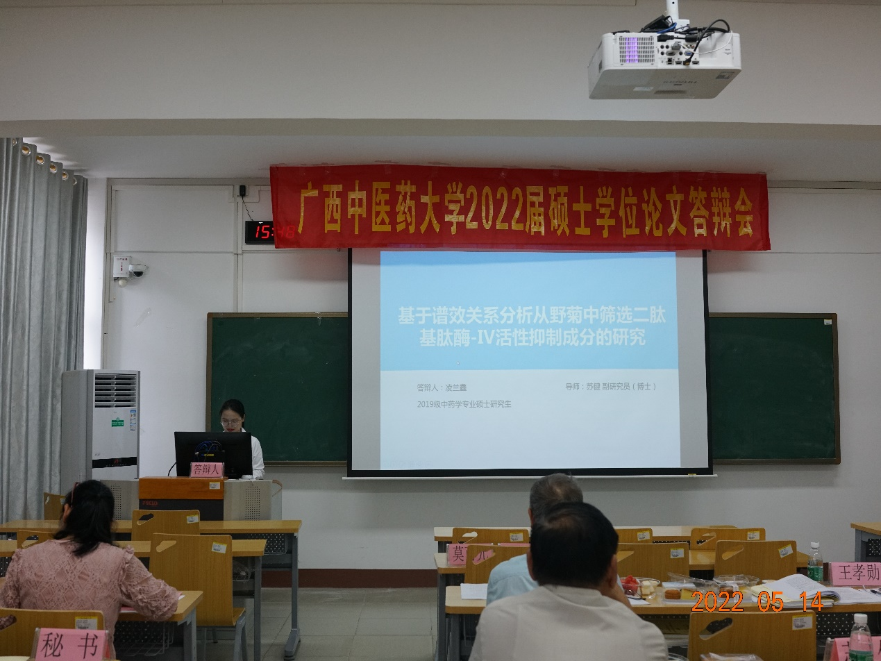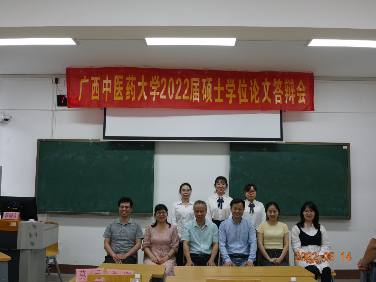 5月14日下午,平台实验室硕士研究生毕业答辩会于beat365官方网站明秀校区时珍楼6-606教室顺利召开。本次答辩对象为2019级研究生。答辩会主席为自治区人民医院莫可元主任中药师,答辩委员会委员有beat365官方网站梁子宁博士教授、王孝勋博士研究员、梁爽高级实验师、戴忠华博士副教授,答辩秘书张淼老师。