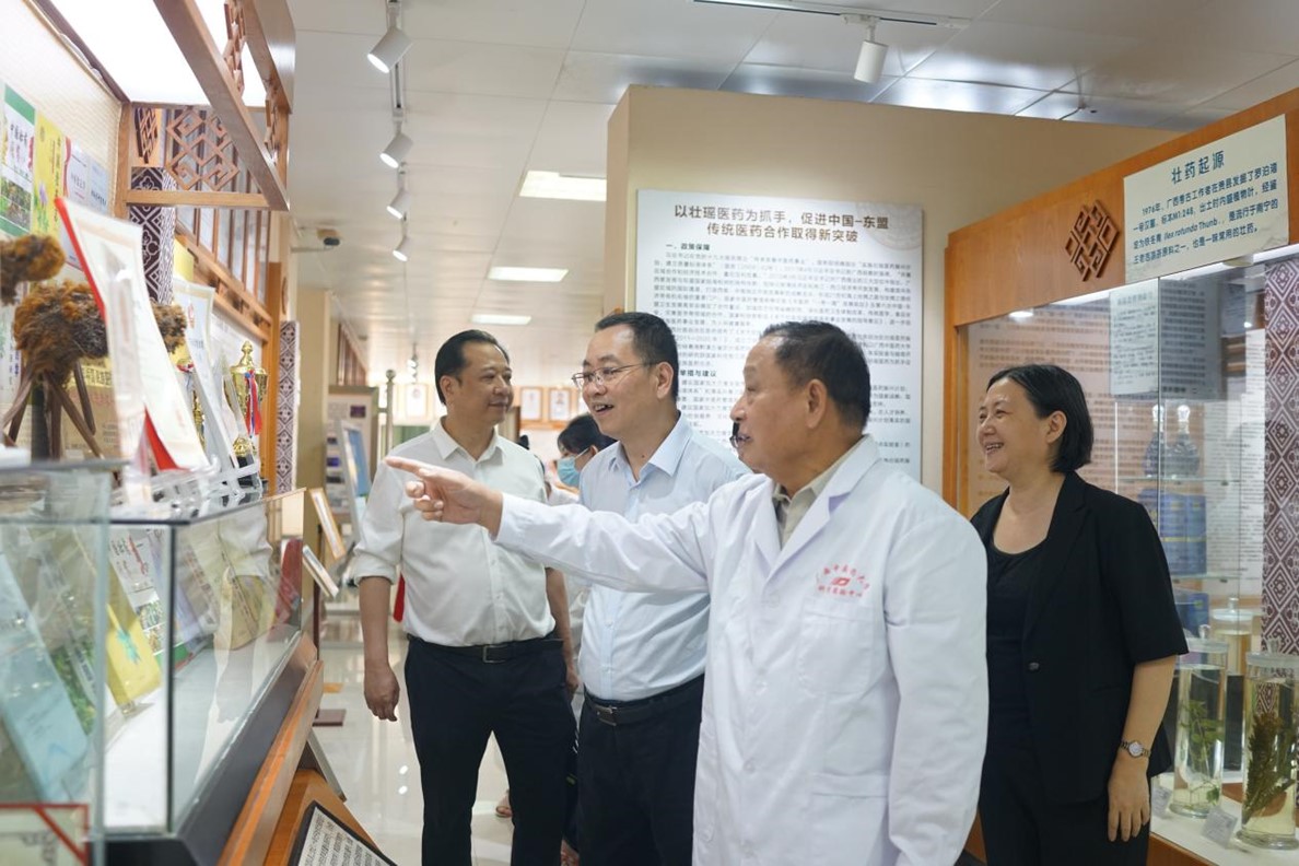 5月30日,校长姚春、广西壮族自治区科学技术厅副厅长廖文军一行来到壮瑶药重点实验室调研,实验室主任朱华教授表示热烈欢迎。朱华教授陪同廖文军副厅长一行考察了实验室展厅,介绍了实验室的壮瑶药理论研究成果和实验研究成果,展示了中药资源普查的数据库与标本库。廖文军副厅长对《壮瑶药研究》期刊的创办给予较高评价,并给出壮瑶药学科建设相关建议。