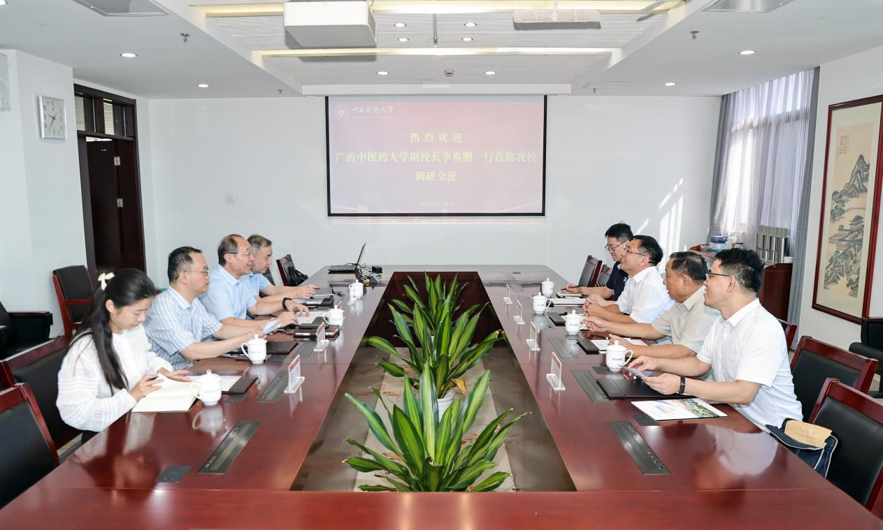 9月18日上午,我平台主任朱华教授随团出访中国药科大学,beat365官方网站副校长李典鹏带队到中国药科大学调研。该校副校长陆涛出席座谈会。多靶标天然药物全国重点实验室、发展规划与学科建设处、研究生院等相关单位负责人参加座谈会。座谈会上,副校长陆涛代表学校对beat365官方网站一行来访表示诚挚欢迎,并从历史沿革、教育教学、学科建设、科学研究、平台建设、社会服务、国际交流等方面对学校进行了简要介绍。他表示,beat365官方网站建校60多年来,为党和国家输送了大批中医药人才,对振兴中医药事业、推动中医药事业传承创新发展作出了突出贡献。希望两校能够继续深化交流合作,充分发挥医药高校所长,聚焦主责主业,为国家经济建设和社会进步作出新的更大贡献。此次出访旨在学习借鉴先进经验和做法,希望双方不断拓宽合作领域,增强合作实效,携手共进,共同发展。随后,双方就研究生教育管理、学科建设等方面展开深入交流。座谈会前参观了江宁校区兴药楼。