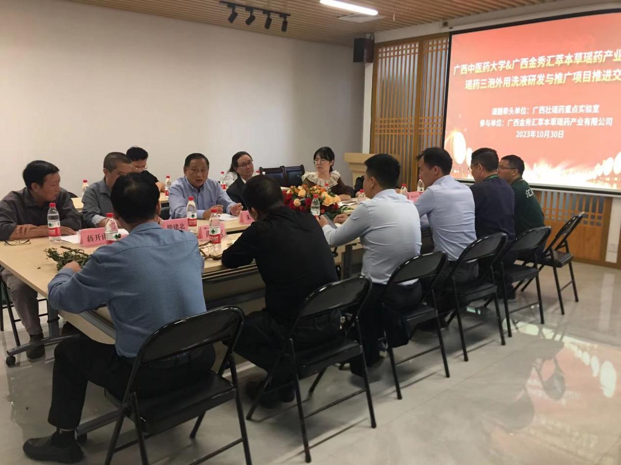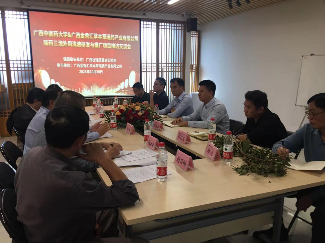为了加强“广西中药民族药产业科技专项—瑶药三泡外用洗液的研发与推广”、广西重点研发计划项目“广西产 5 种壮瑶药材质量标准与产品开发研究”和广西科技基地与人才专项“beat365官方网站-中南大学壮瑶药研究联合实验室”等项目的产学研合作,推进项目顺利进行,2023年10月30日,我平台主任朱华教授及平台骨干甄汉深教授、谢凤凤博士、张淼老师、蒋开雨老师、余秀琪老师和研究生代表等一行人赴广西金秀汇萃本草瑶药产业有限公司洽谈交流。