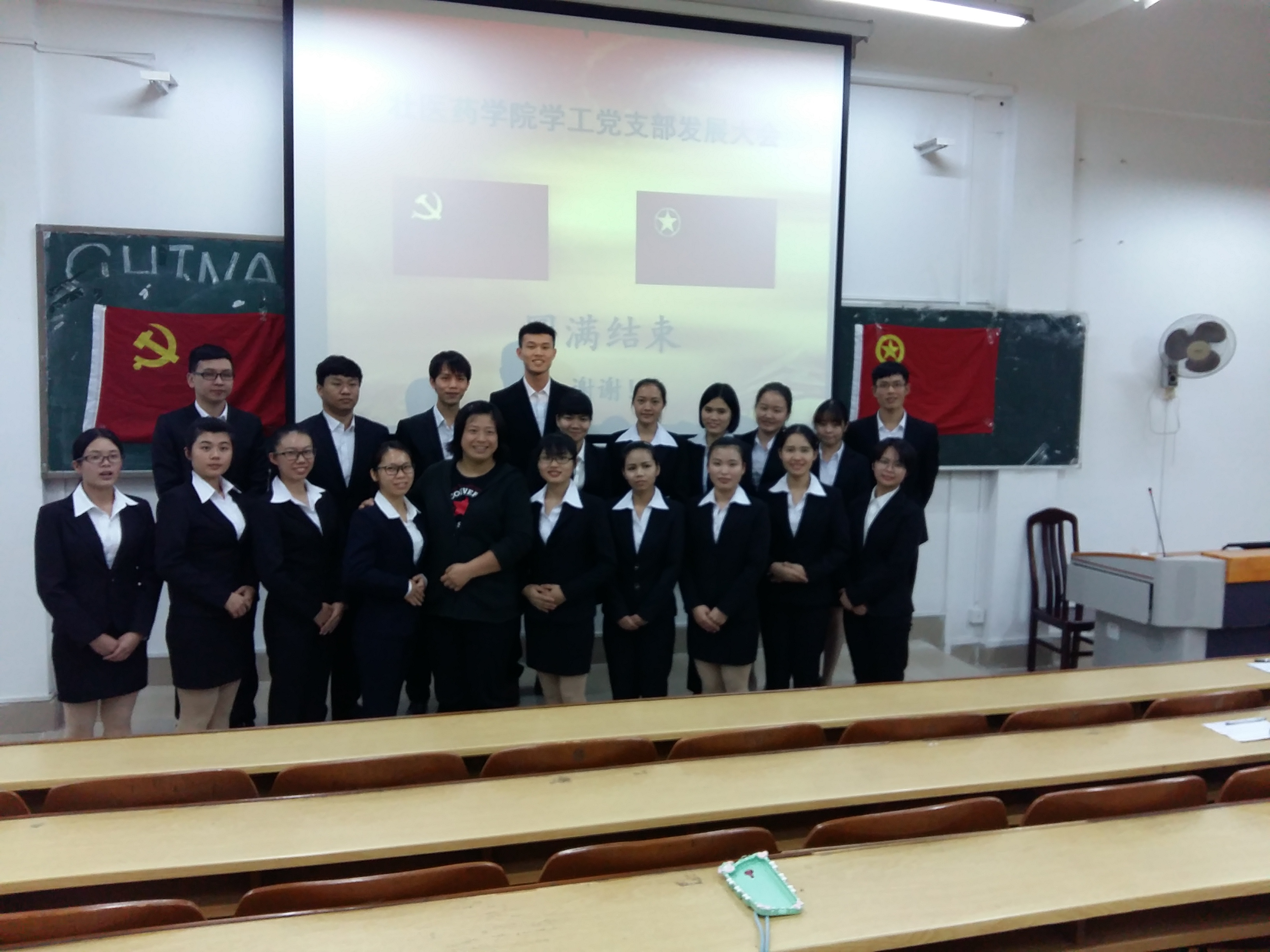 2016年12月25日19:00,壮医药学院学工党支部预备党员转正暨党员发展大会,在明秀校区东梯二教室成功召开,大会由学工党支部组织委员王雪松主持,参加此次大会的有学院学工党支部书记兰天莹老师、学工党支部全体党员及拟发展对象,总计38人。