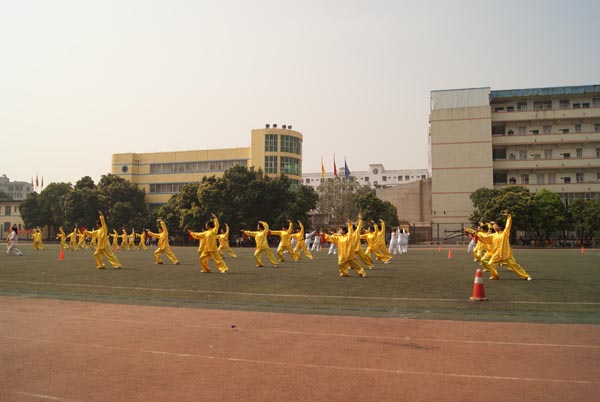 柔金色的飘逸太极服,红色缎带腰间一缠,释放出少年的一腔义气热血。三路长拳比赛伊始,便有无数的少年热血随着比赛音乐而翻腾起伏,一决高下。上届男子三路长拳冠军08壮医的男生们一出场就气势如虹,在猎猎风中衣袂翻飞,未开始但已成气势。待到拳出如风,弹跳间步伐稳健有力,赤红如血的腰带和绑臂随着动作割裂空气,整齐划一的动作引发观众和拉拉队的热烈的欢呼,勃发的热血与朝气感染了在场的每一个人!最后,08壮医再次荣获三路长拳年级第一名!而09壮医也不负众望,摘取了三路长拳年级第四名的好成绩。