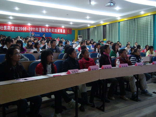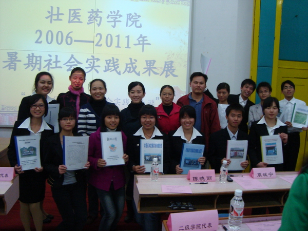 2011年12月4日晚,壮医药学院在西梯一教室成功举办了以“创先争优立杆头,社会实践争上游”主题的社会实践成果展,对壮医药学院2006-2011年所取得的成果进行分享和宣传。出席本次成果展的嘉宾有壮医药学院陈晓丽、陆惠燕、薛丽飞、温海成、覃斌宁老师以及校团委学生会代表和各二级学院代表等。