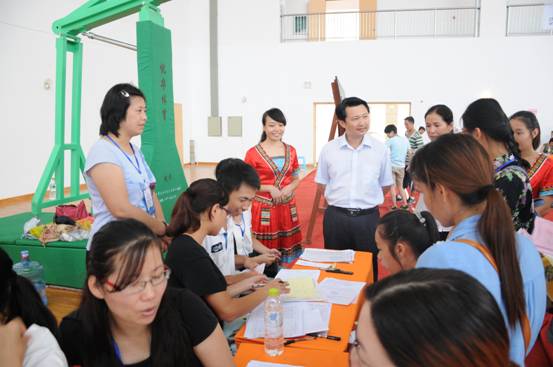 9月13日仙葫校区体育馆内,迎新现场气氛热烈,秩序井然。壮医药学院学生志愿者身着极具特色的壮族服装,学校党委书记朱华,校党委副书记、纪委书记杨连招对志愿者热情服务新生的态度表示肯定和称赞,并与志愿者们亲切地合影留念。副校长庞宇舟在迎新现场详细询问了新生入学报到情况,并嘱咐迎新工作要做到热情、细致、周到,力求为学生及家长提供优质高效的服务。领导的关心让壮医药师生们备受鼓舞,老师们仔细地为新生检查入学档案和解答各种问题。壮医专业2010级、2011级学生分上、下午两批从明秀校区赶到仙葫校区参加志愿者服务工作,他们肩扛手提帮拿行李,带领新生报到,安顿食宿,亲切、热情的态度给家长们留下了深刻印象,让新同学来到学校的第一天就感受到了大家庭的温暖。