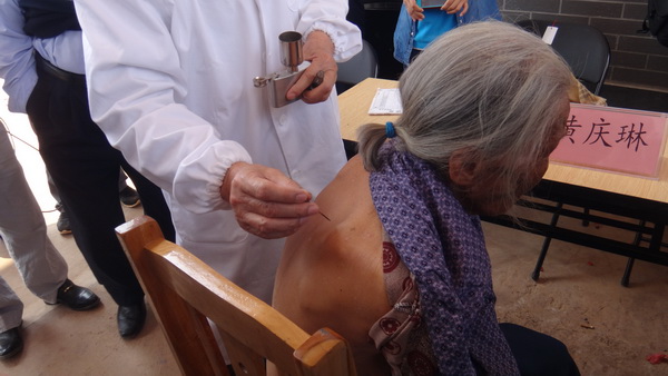 该诊疗点利用壮医保健养生的技术优势,帮助老人们达到健康享受晚年生活的目标。与会专家为老人们义诊,并免费送医送药。壮医药学院同学们积极参加活动,有的当翻译、有的测血压、有的帮忙搬桌椅板凳,每个人都为关爱老人义诊出一份力。现场专家的壮医经筋手法、壮医火针疗法等特色疗法对当地老人多发的风湿骨痛起到很好的治疗作用,深受患者欢迎。同学们学习热情高涨,学到了壮医经筋、壮医火针的操作方法以及手诊、脉诊等等,同学们还利用在学校学到的技能,为老人们做手法治疗,得到老人们的赞扬。